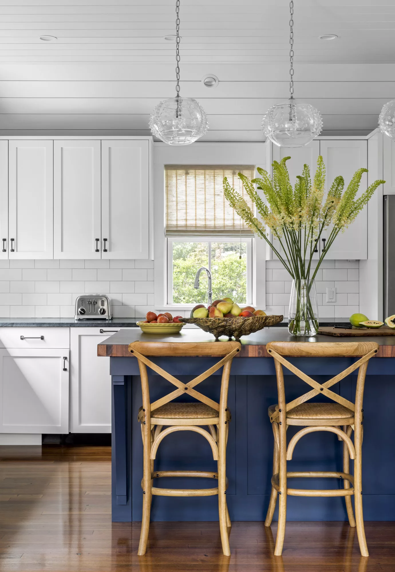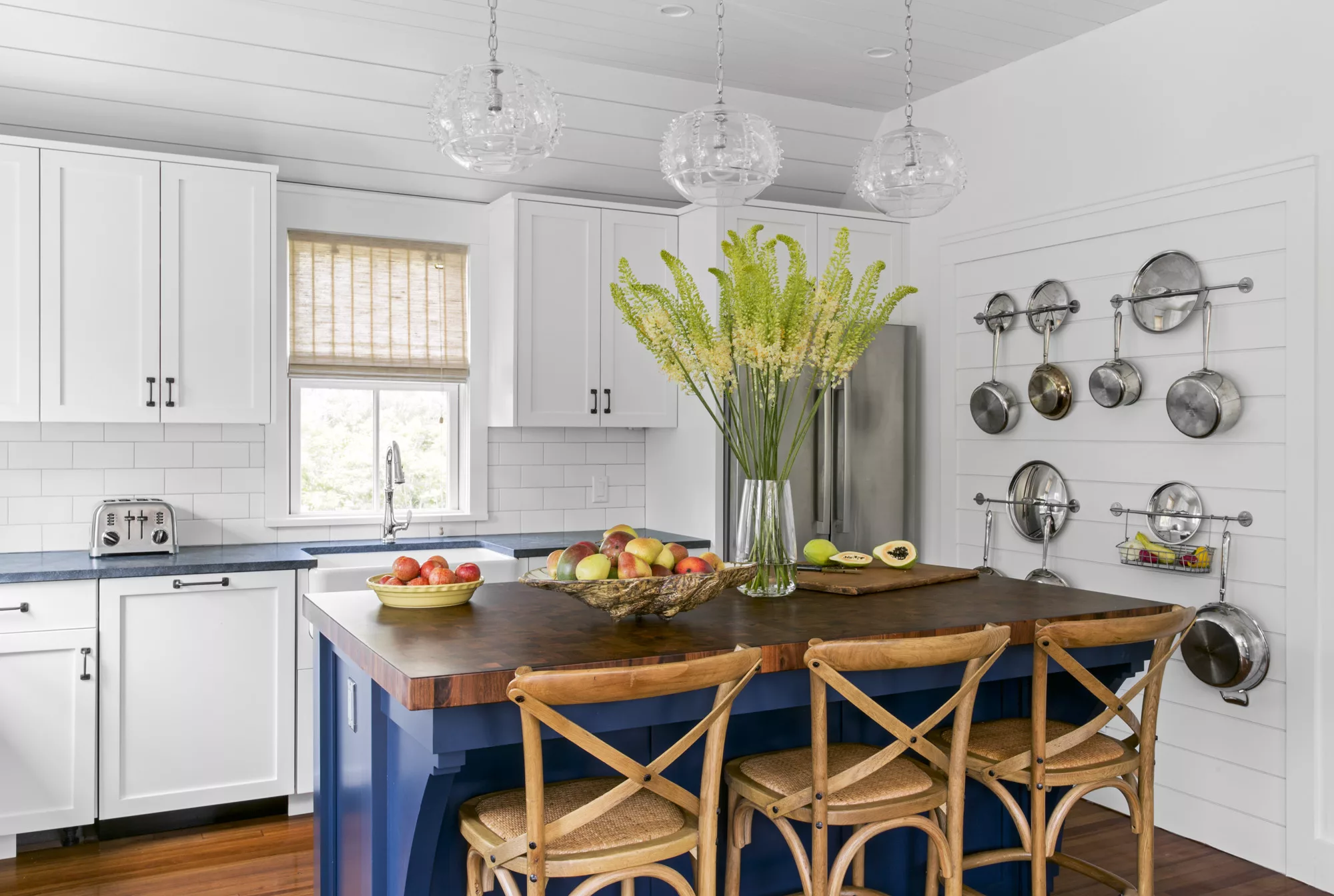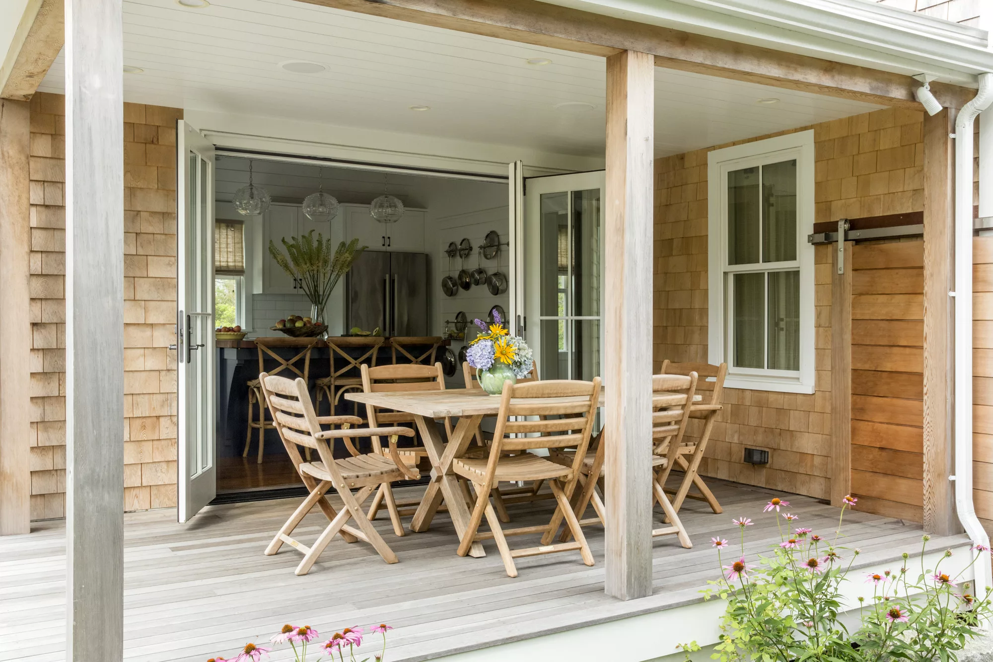 Situated on a small village property with limited room for expansion, the design focused on maximizing the available space. A new porch was added adjacent to the kitchen, featuring a bi-folding door system that created an “outdoor room” for enhanced summer entertainment. Inside, the existing cramped, compartmentalized spaces were gutted and reconfigured to open the visual flow of the small living areas. The absence of detailed interior architecture allowed for a creative opportunity to infuse character throughout the home, using materials to evoke memories of summers past and create a cohesive, inviting atmosphere as one moves through the spaces.