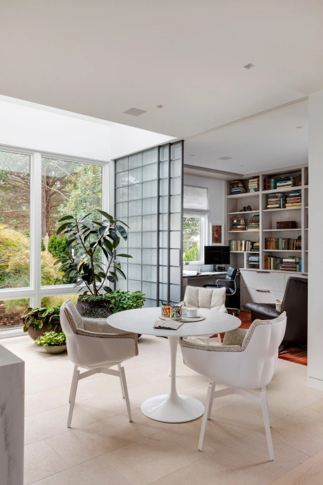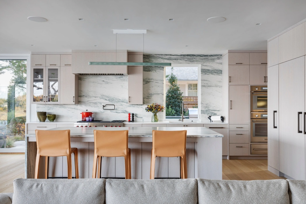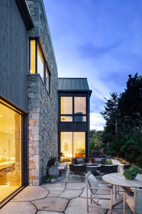 The home is decidedly green and built for aging in place. Long discussions over wine and while taking int eh view or trips to galleries, quarries and nurseries outlined a vision of a welcoming home, that will “be the place everyone wants to have a party, bring a friend, take a vacation or just call home”. The home consists of a double garage / carriage house with guest space above and a main house that offers a soaring central stair, massive operable glass wall panels and views from each of the 4 main house bedrooms. A playful and crafted approach to the built space and the décor reflects the owner’s tastes, travels, collections and love of natural materials. A playful bunk room, nursery, bee keeping shed, workshop, sculpture garden, elevator, gym, gallery walls, a gift room and a true cook’s kitchen, all found a place in the composition of a house that tells two life stories.