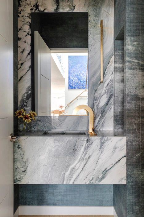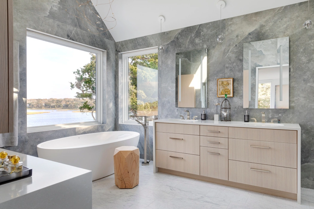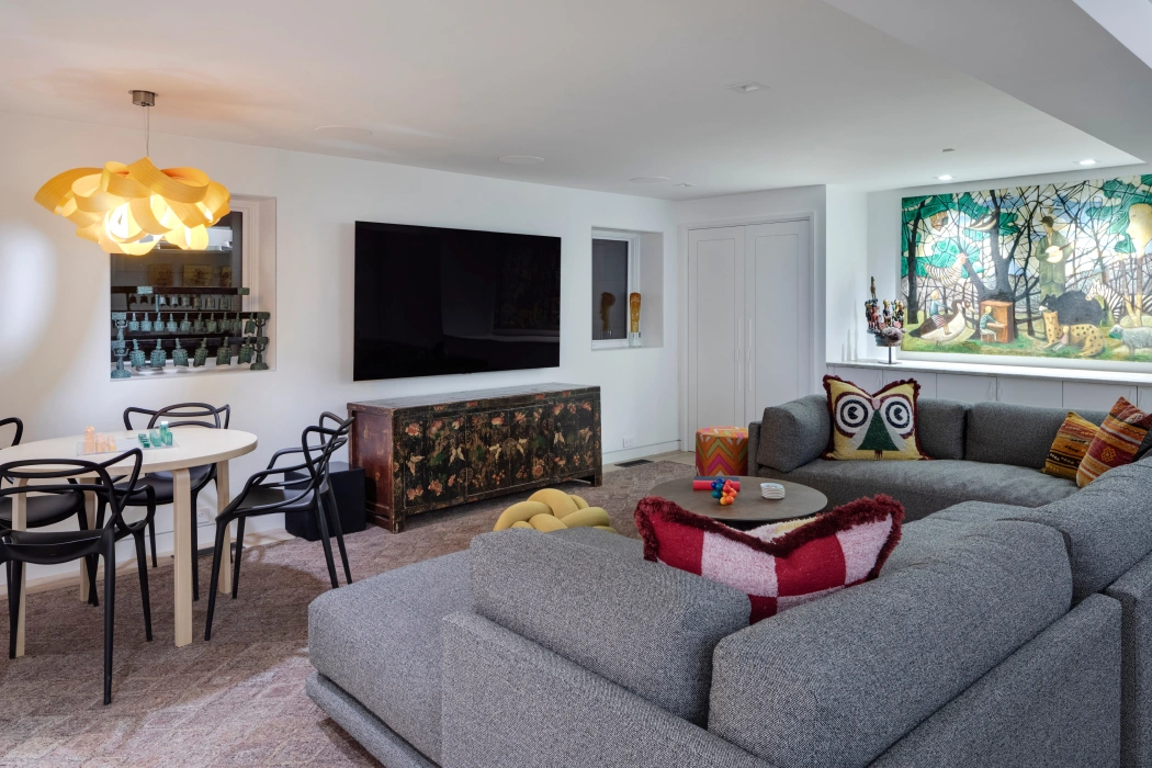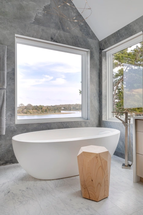 This new construction home was built on a cliff dune on the outer Cape. The original home was a small cape that was hidden by acres of trees and plantings and had limited water views. The new owner’s goal was to create a generational home that would bring their blended family of adult children, grandchildren and wonderfully curated art collection together. The homeowners met, started the project and married through the course of the project and embraced the design of a new home to define their new life together.